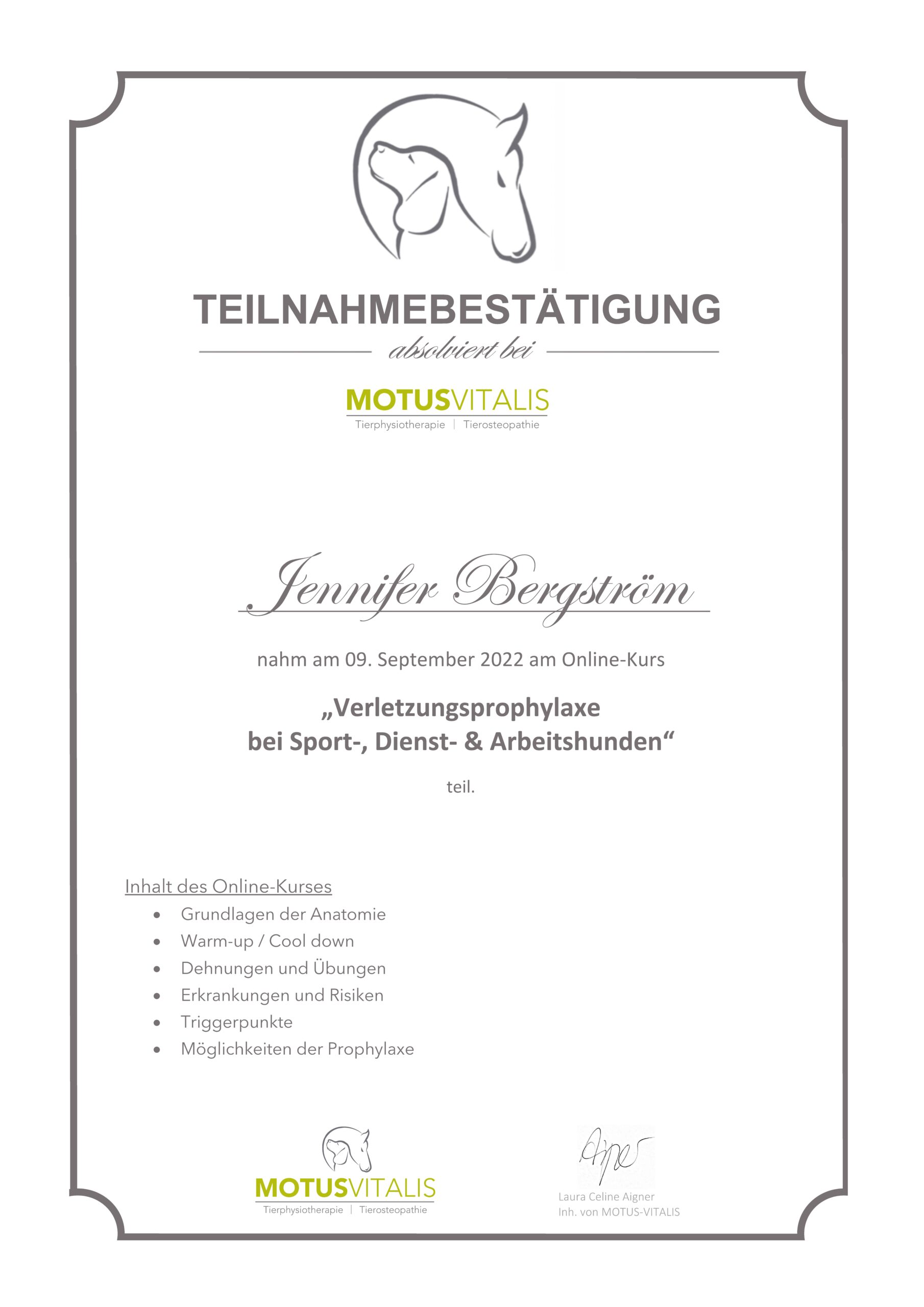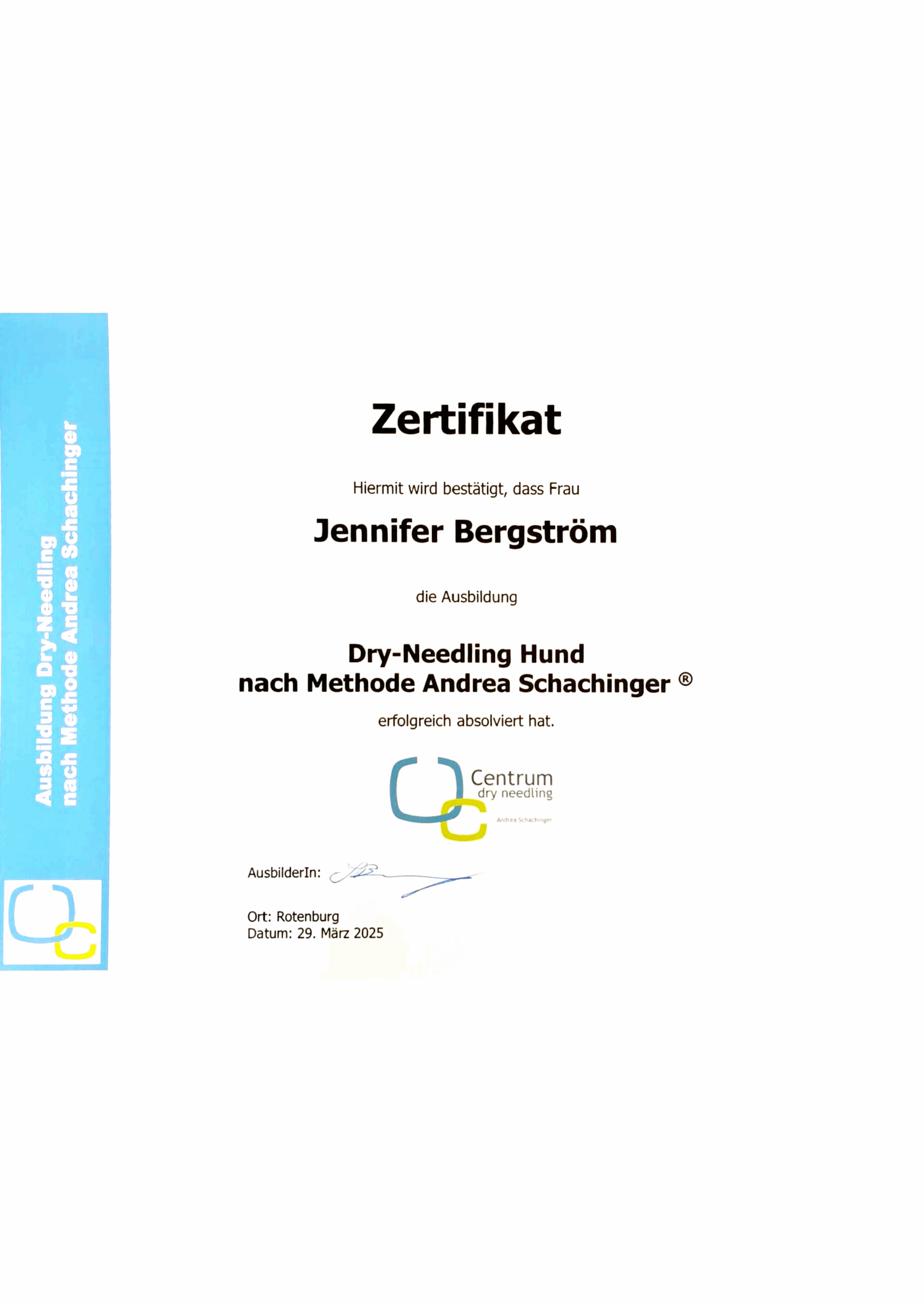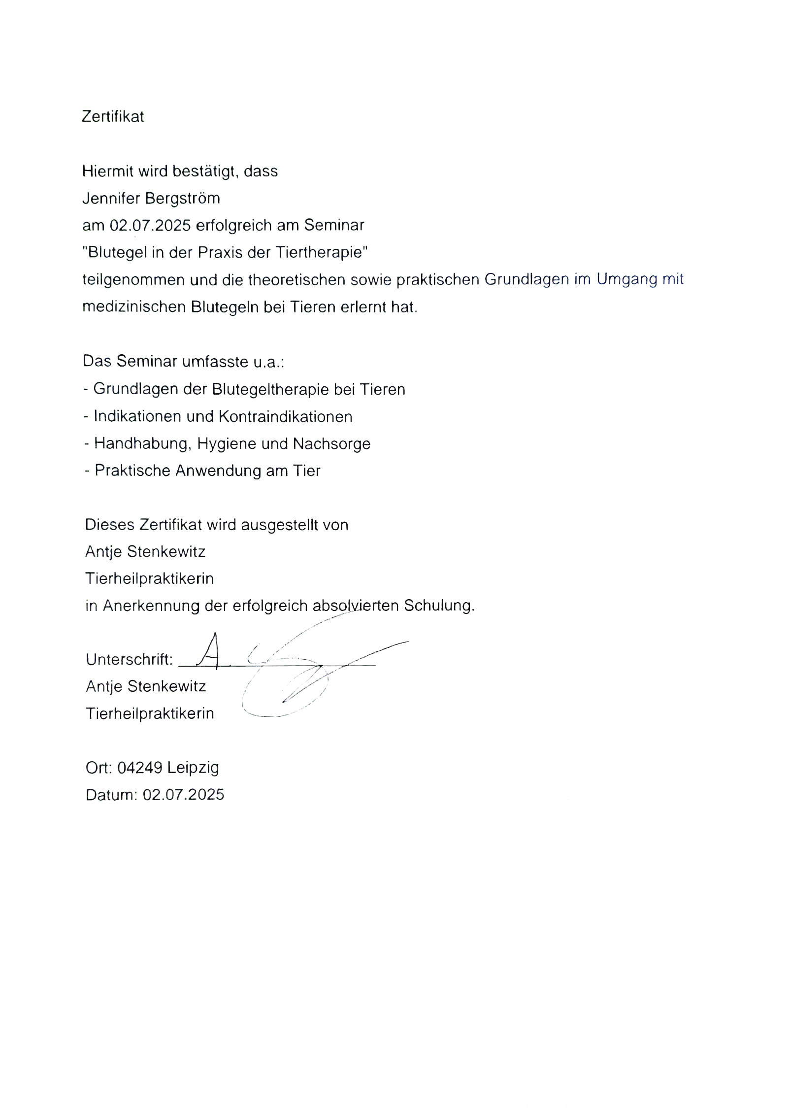 Tiere begleiten meinen Alltag seit jeher, und ein Leben ohne Vierbeiner ist für mich zwar möglich, aber nicht vollständig. Vierbeiner schenken uns bedingungslose Zuneigung, hören uns zu und spiegeln unsere Seele. Diese tiefe Verbundenheit und Leidenschaft führten mich dazu, 2022 meine Ausbildung zur Tierphysiotherapeutin zu beginnen, um Tieren etwas zurückzugeben und zur Schmerzbefreiung und -linderung beizutragen.